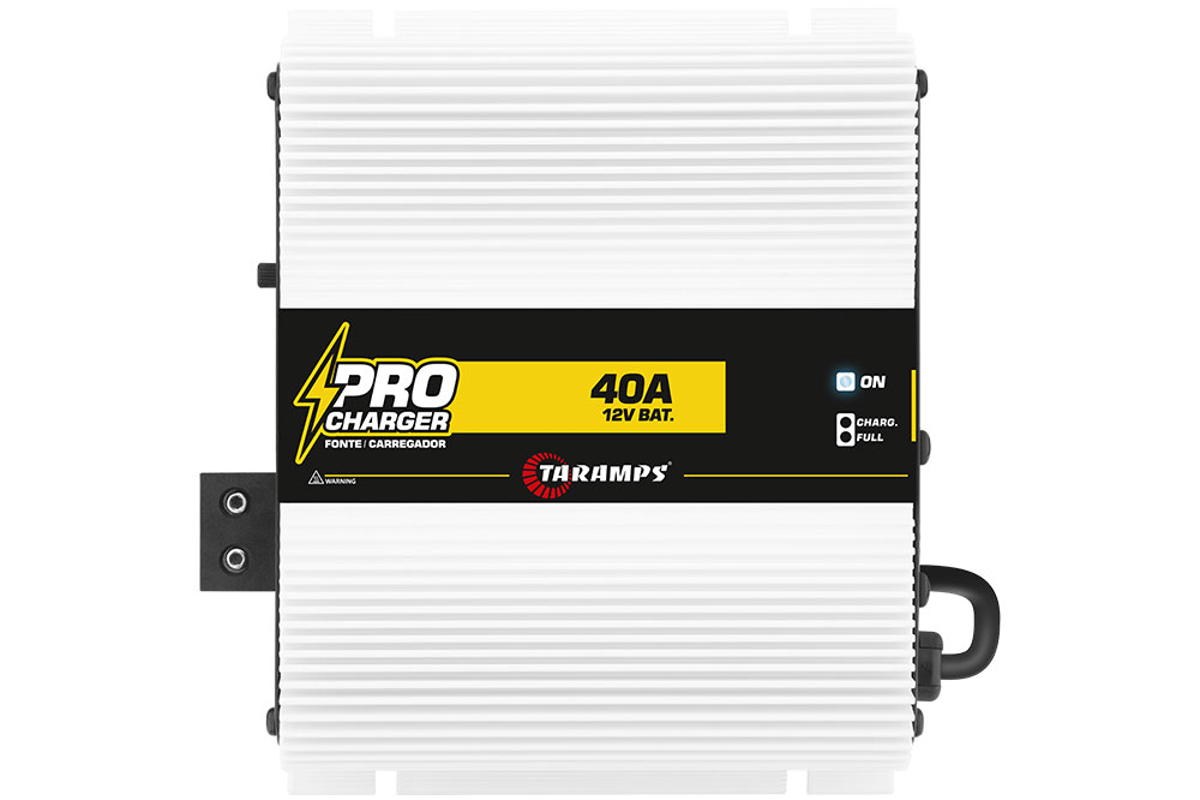 Présentation du Pro Charger 40A. Ce chargeur et source de batterie bivoltage (127/220V AC) dispose d'un réglage de tension variable (12V DC à 14.4V DC) et d'un indicateur de pleine charge.